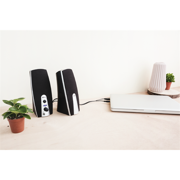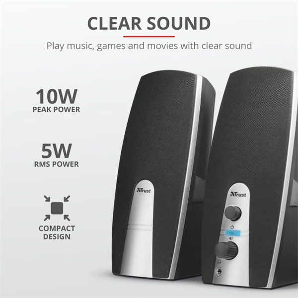 Compact stereo speaker set with 5 Watt RMS output (10 Watt peak power)